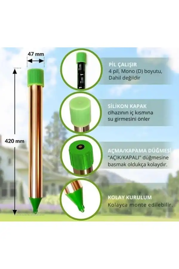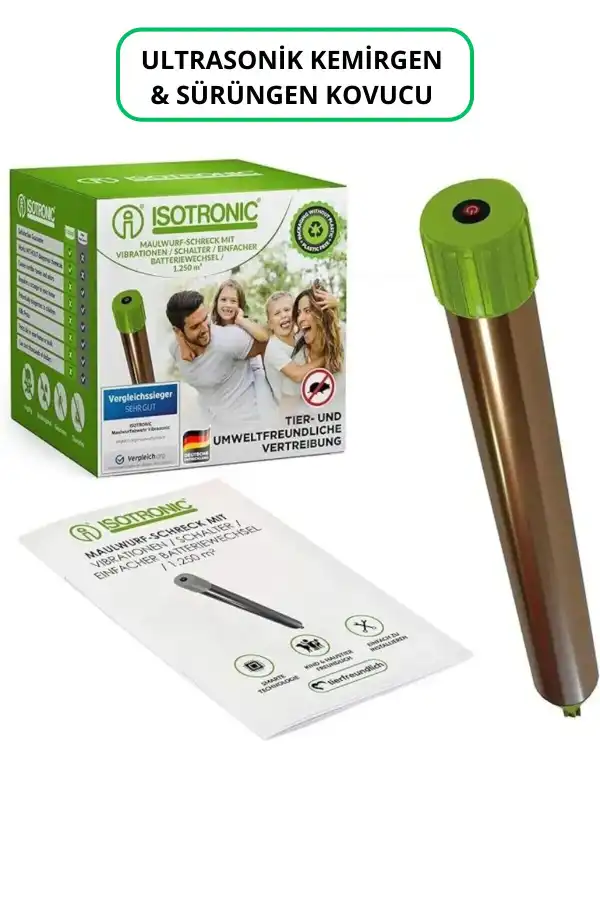 Gelince Haber Ver1250 metrekarelik geniş alanları etkin bir şekilde koruyan ultrasonik kovucu, kemirgen ve sürüngenlerin rahatsız edici varlıklarını uzaklaştırır. Pil ile çalışan bu cihaz, enerji tasarrufu sağlayarak sürekli kullanım imkanı sunar. Titreşim ve ultrasonik frekanslar aracılığıyla çalışarak, kemirgen ve sürüngenlerin doğal yaşam alanlarından uzak durmasını sağlar. Güvenlik açısından tehlikeli madde içermez; çocuklarınız ve evcil hayvanlarınız için güvenlidir. Biyosidal kayıt numarasına sahip olmayan bu ürün, çevre dostu bir alternatif olarak öne çıkar. Alman menşeli olan Altın Parmak Ultrasonik Kovucu, kalite standartlarına uygun üretilmiştir. Makine formunda tasarlanmış olup, kolayca montaj yapılabilir ve pratik bir kullanım sunar. Pil ile çalışır.; (Mono D 1,5 v 4x) - Piller dahil değildir. Hava koşullarına dayanıklı, sağlam alüminyum tüp.