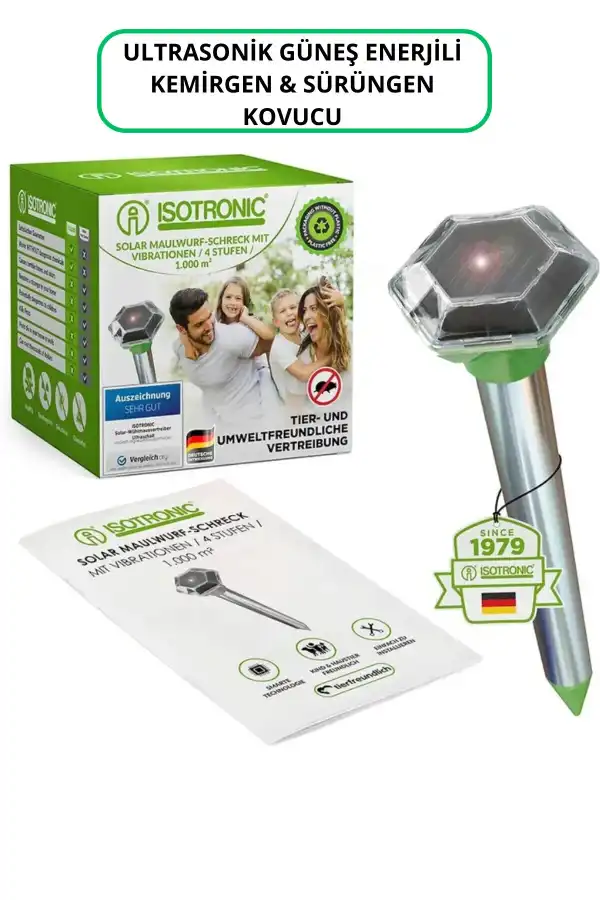 Gelince Haber VerGüneş enerjisiyle çalışan ultrasonik titreşimler sayesinde, 1000 metrekareye kadar geniş alanlarda kemirgen ve sürüngenleri uzak tutar. Tehlikeli madde içermez; güvenle kullanabilirsiniz. Biyosidal kayıt numarasına sahip olmayan bu ürün, çevre dostu bir seçenektir. Güneş enerjisini kullanarak elektrik tüketiminden tasarruf sağlar ve sürdürülebilir bir çözüm sunar. Alman menşeli olan bu makine, yüksek kalite standartlarına uygun olarak üretilmiştir. Kolay montaj imkanı sunan tasarımı ile pratik kullanım sağlar.
