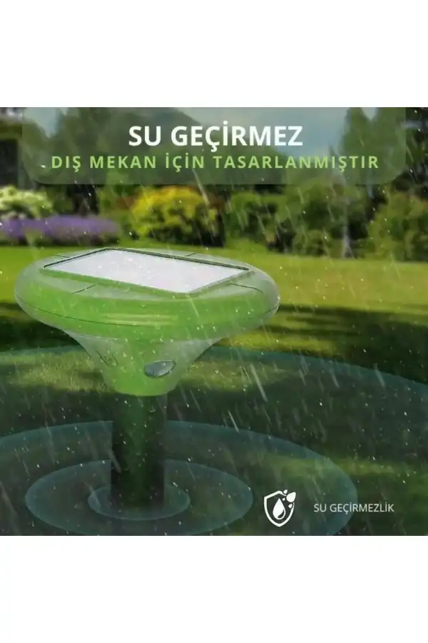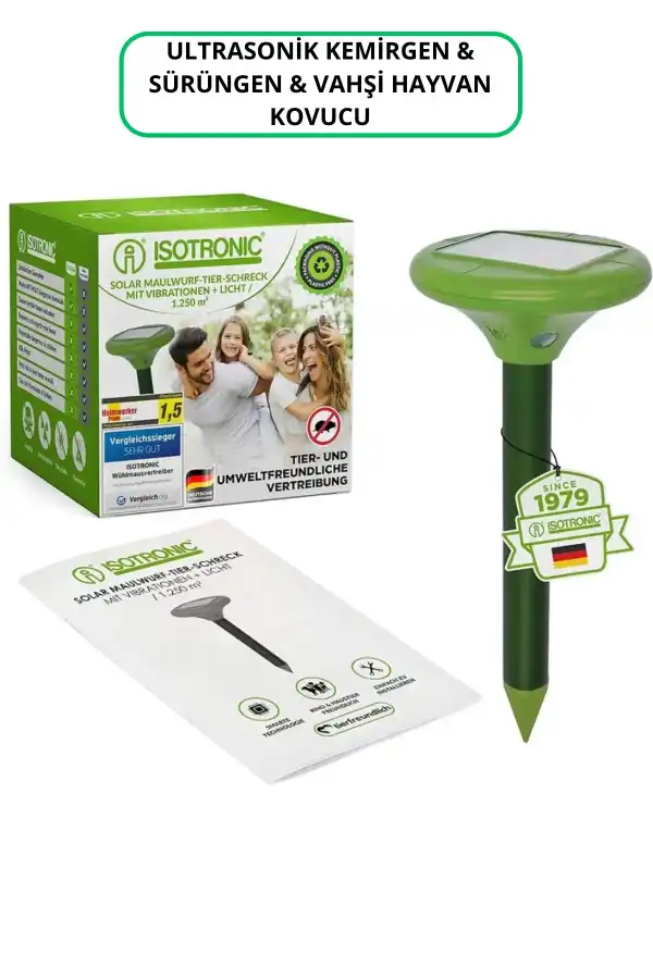 Gelince Haber VerGüneş enerjisiyle çalışan bu cihaz, enerji tasarrufu sağlarken etkili bir şekilde hayvan kovuculuk yapar. Yılan, fare, köstebek, karınca ve rakun gibi çeşitli vahşi hayvanları uzak tutmak için tasarlanmıştır. Güneş enerjisi sayesinde elektrik prizine ihtiyaç duymadan çalışır; böylece her yerde kullanılabilir. Biyosidal kayıt numarasına sahip olmayan bu ürün, güvenli ve çevre dostudur. Almanya menşeli olan bu makine, yüksek kalite standartlarına uygun üretilmiştir. Ultrasonik teknolojisi ile çalışarak zararsız ses dalgaları yayarak hayvanları uzaklaştırır. Kapsam Alanı Yaklaşık : 1250 m². Hava koşullarına dayanıklı. Gerilim Rezervi: ışığa maruz kalmadan 6 gün.